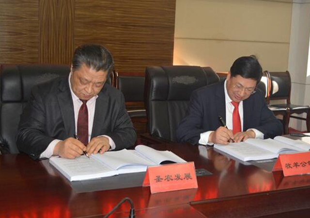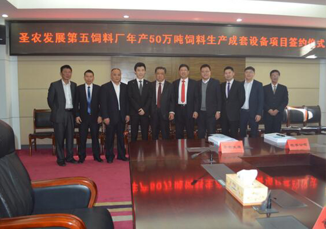 2016年12月10日,圣农发展第五饲料厂年产50万吨饲料生产成套设备项目签约仪式在总部举行。傅光明董事长同牧羊集团范天铭总裁共同签署了合作协议。