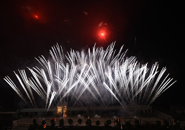 整场焰火晚会分“圣农盛世”、“ 腾飞圣农”、“ 冠军风采”、“ 祝福圣农”四个乐章。有别于往年,今年举办的是音乐焰火晚会,焰火燃放节奏与音乐旋律、意境有机融合,锻造出一种火与音乐、光与节奏的完美效果。晚会采用3D立柱焰火、无人机焰火,9架无人机呼啸而过、腾空跃起,安装在无人机上的冷光烟花璀璨绽放,伴随着无人机的移动、摇摆,在夜空中跳起炫酷的焰火舞。而30多米高的3D立柱上,伴随着动感的音乐,焰火按旋律燃放,时而左右齐发,时而旋转喷射,将晚会推向又一个高潮。