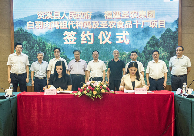 8月6日上午,圣农集团与资溪县政府在大觉山酒店举行“白羽肉鸡祖代种鸡及圣农食品十厂项目”签约仪式,吴淑琴县长、傅芬芳董事长代表双方签订协议,并互换文本。圣农集团创始人傅光明,中科院院士、江西农业大学党委书记黄路生,中国白羽肉鸡首席科学家文杰,江西省农业农村厅副厅长刘光华,抚州市副市长徐国义,资溪县委书记黄智迅等参加了签约仪式。
