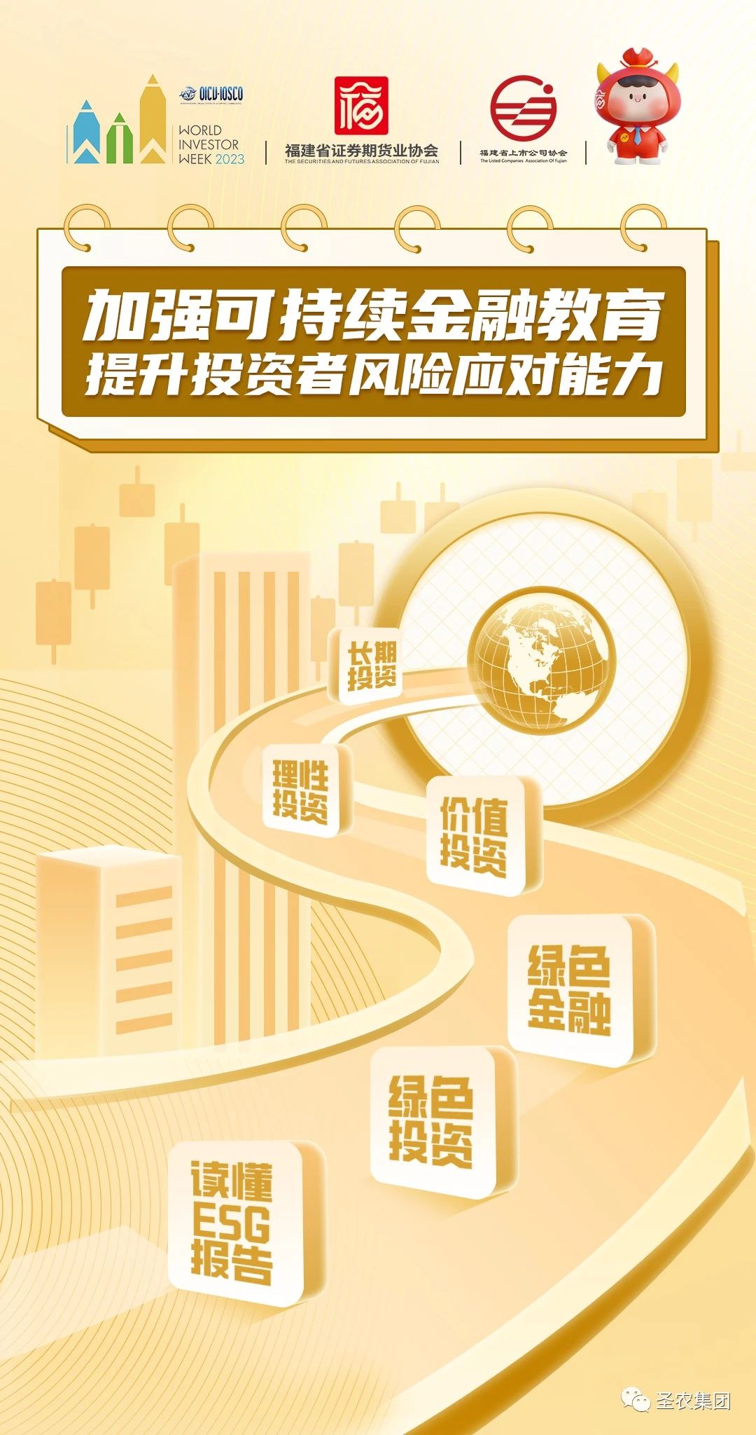 为使更广泛的投资者可以从其组织开展的投资者教育和保护工作中获益,在福建证监局的指导下,圣农发展(002299)开展“2023年世界投资者周”系列活动,本次世界投资者周活动主要围绕“投资者风险应对能力”和“可持续金融”两大主题,旨在增强广大投资者风险防范意识,传递理性投资、价值投资、长期投资理念。在此,特提醒各位广大投资者:理性投资,防范风险。