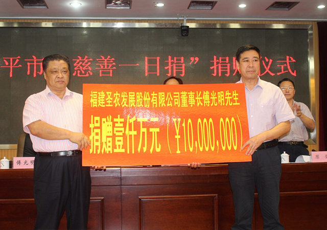 2015年8月11日,在南平市举行的“慈善一日捐”捐赠仪式上,南平市慈善总会会长、圣农发展股份有限公司董事长傅光明再次以个人名义捐赠1000万元。他承诺,将以每年1000万元的额度,向该会连续捐赠20年。他是这么说的,也是这么做的,迄今为止,已连续八年向市慈善总会捐款8000万元。