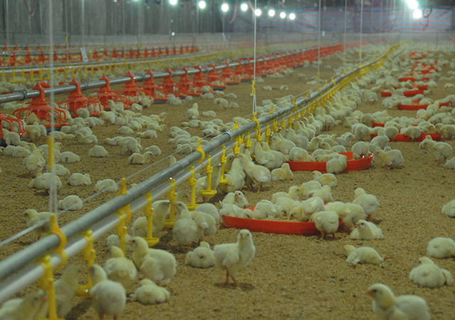 经过严格的消毒程序,运送苗鸡的专用空调车,缓缓驶入大洲肉鸡场,从此,小鸡们过上了食来张嘴、风吹不到雨淋不着的幸福生活。