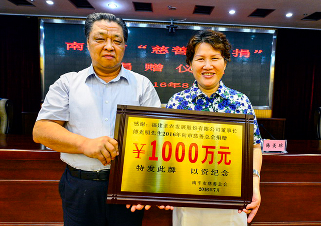 2016年8月3日,2016年南平市“爱心助学•慈善一日捐”捐赠仪式在延平举行。南平市慈善总会会长、福建圣农发展股份有限公司董事长傅光明捐赠1000万元。迄今为止,傅光明董事长向市慈善总会累计捐款9000万元。